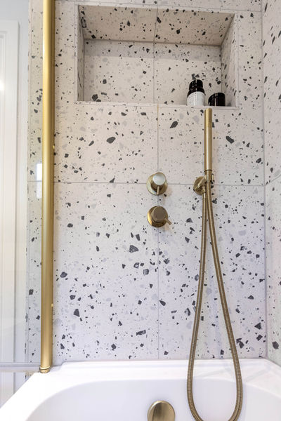 Our client was looking for a contemporary take on a traditional bathroom. They were after a very simple look with a bold statement colour to shine through. Using Terazzo Tiles by Mandarin Stone, with Brushed Brass fixings and brass ware, finished with Textured Marmorini Venetian plastering, the finished product was truly unique.